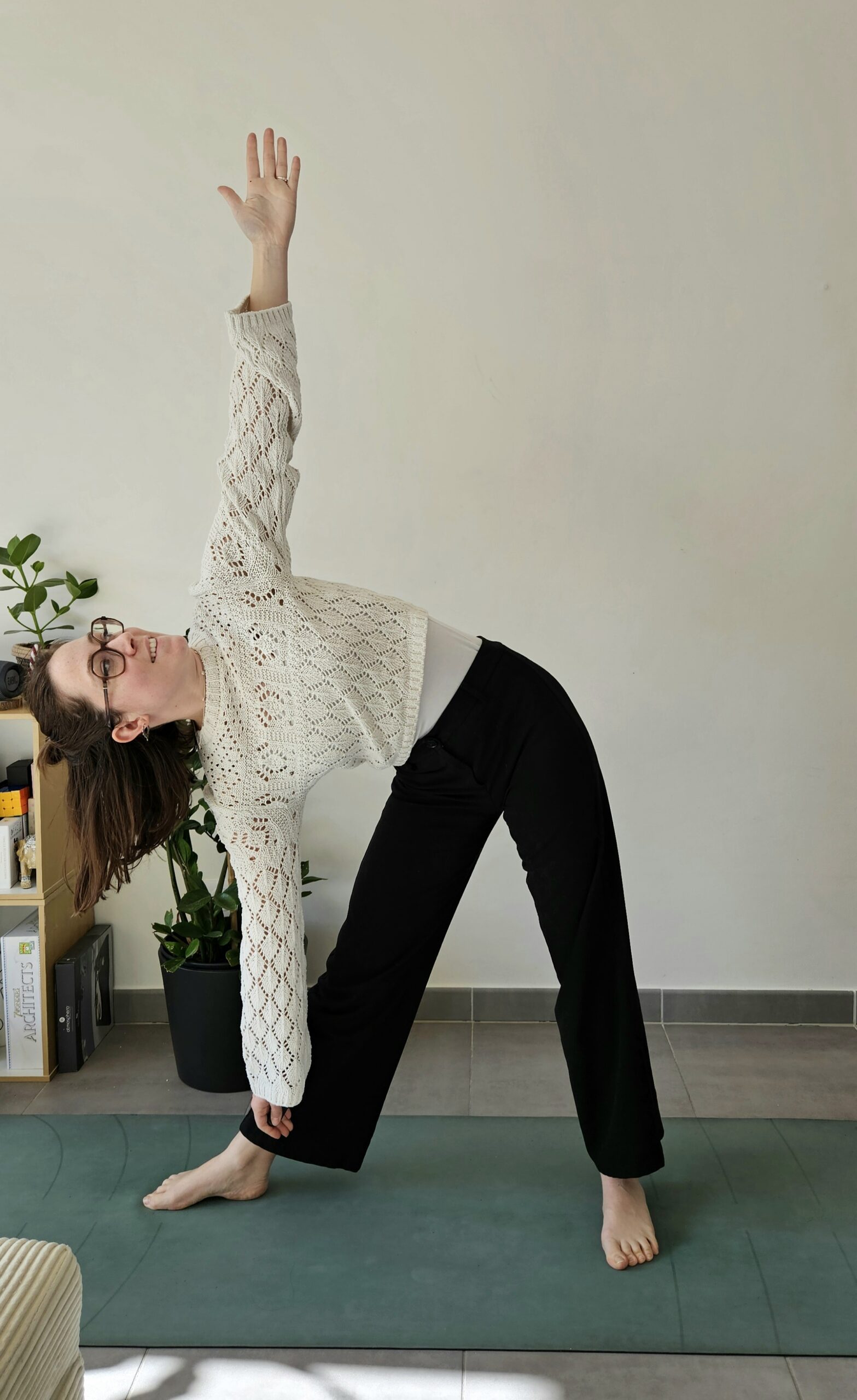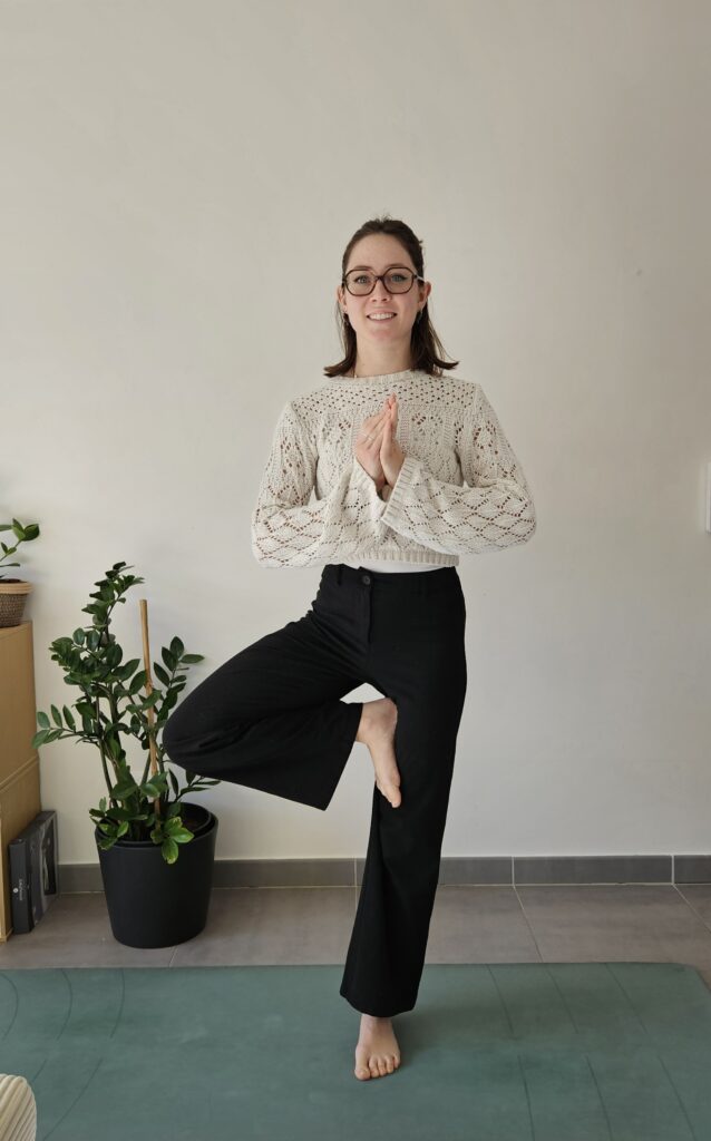 Chaque cours est pensé pour tous niveaux, même débutant(e)s. Je propose différentes variations pour que chacun puisse explorer la posture à sa manière, selon son énergie et ses besoins du moment.